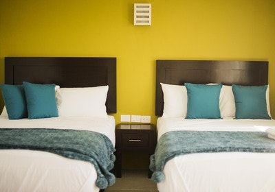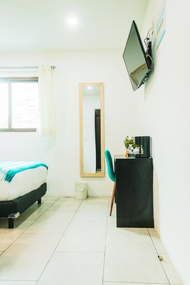 Habitacion con capacidad maxima de 4 personas, incluye Smart tv, A/C, refrigerador, cafetera, y baño privado con amenidades.