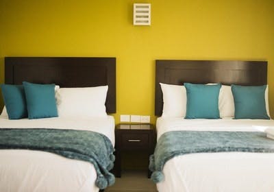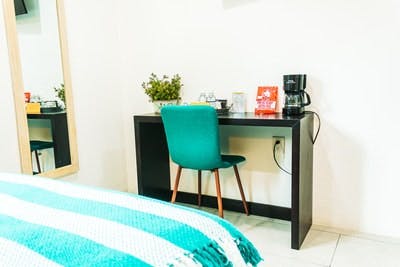 Room with a maximum capacity of 4 people, includes Smart TV, A/C, refrigerator, coffee maker, and private bathroom with amenities.